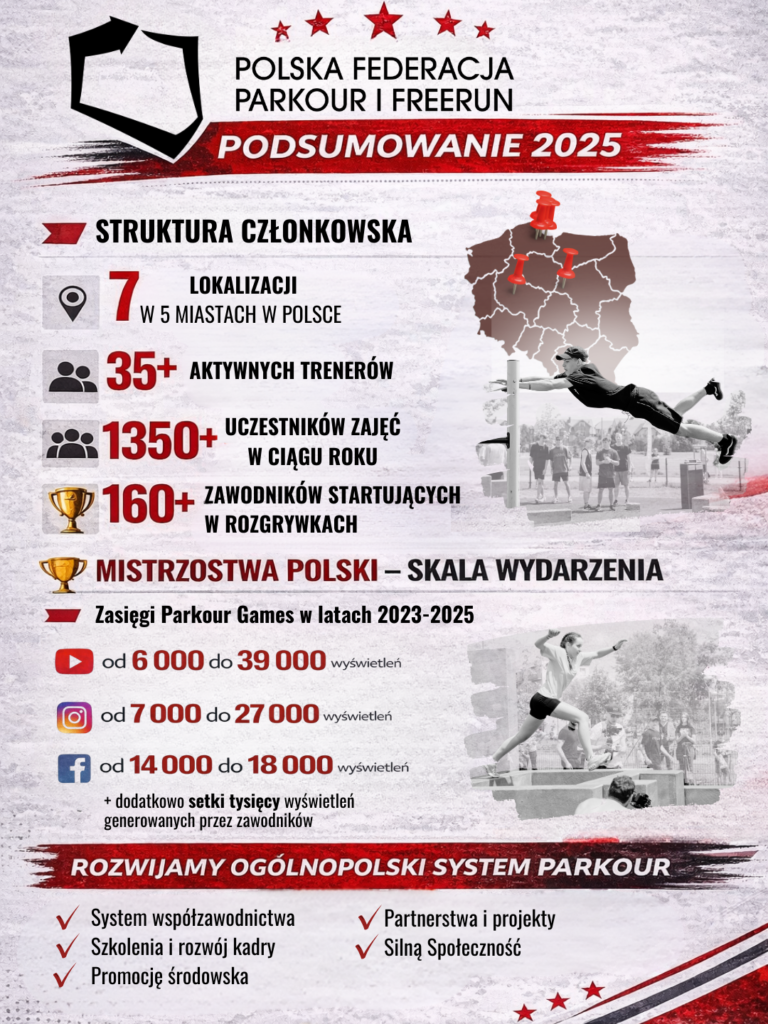 Federacja powstała pod koniec 2014 roku poprzez zrzeszenie się najintensywniej działających w Polsce organizacji parkour i freerun. Naszą myślą przewodnią jest promocja i rozwój tych dyscyplin na skalę kraju. Do naszych głównych działań należy: